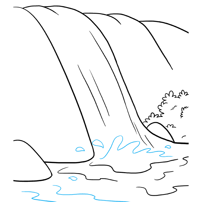 8. Vẽ nhiều văng và gợn sóng ở dưới cùng của thác. Vẽ một đường lượn sóng để biểu thị sự nhiễu loạn ở phía dưới và vẽ thêm các đường lượn sóng xung quanh các đường tròn được vẽ trong các bước trước. Kèm theo một số hình dạng giọt nước mắt, cho thấy các vệt bắn ra ngoài từ thác.