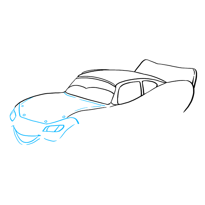 7. Chi tiết mặt trước của xe. Sử dụng một đường cong để bao quanh mặt trước của mui xe hình lục giác. Vẽ các đường và vòng tròn nhỏ dọc theo các cạnh của mui xe. Kèm theo các hình bình hành tròn vừa qua phía trước mui xe, tạo thành đèn pha – trong trường hợp của Lightning, chỉ là nhãn dán. Vẽ các đường ngang qua mỗi đèn pha. Sử dụng các đường cong để phác thảo tốt bánh trước và miệng mỉm cười.
